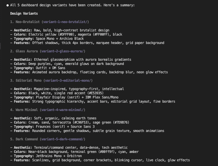 P.P.S. – Want to create your own design skills but feeling overwhelmed? Start here: Download the frontend-design skill from GitHub. Ask for design variants. Pick your favorite. Watch the magic happen. Then write me a thank-you note. Or don’t. I’ll just be here, admiring my glass aurora dashboard and feeling quietly superior to everyone still using default Bootstrap.