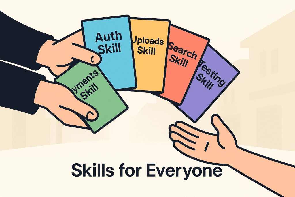 Month 1: You create 3 skills (auth, payments, dashboard) Month 2: You create 5 more (file upload, search, notifications…) Month 3: You realize you can build entire apps in hours