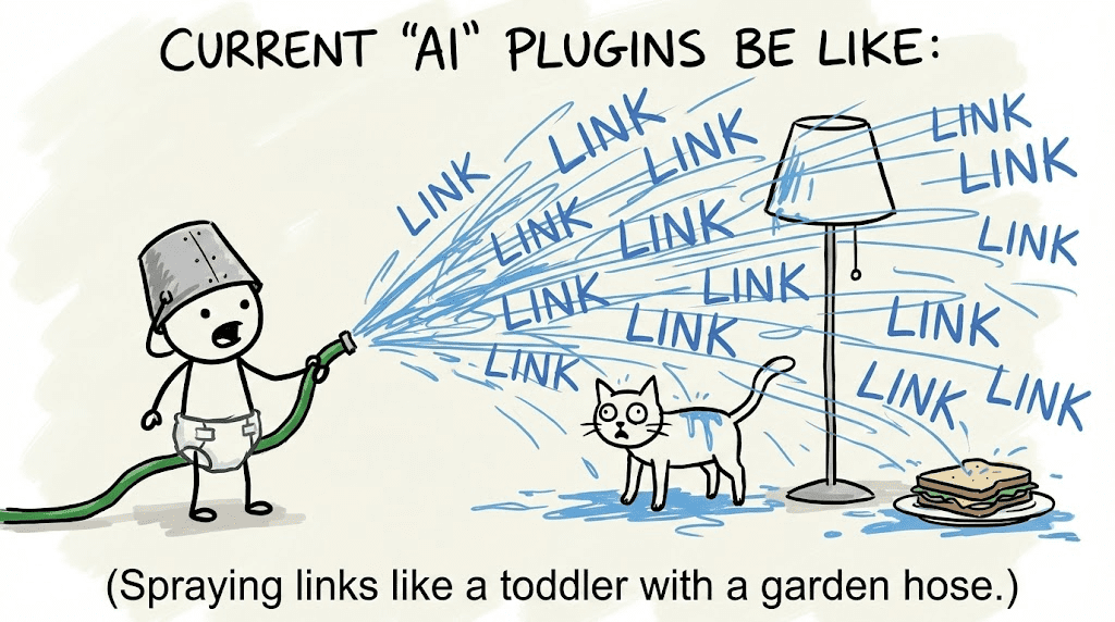 - Keyword-based plugins spray links everywhere like a toddler with a garden hose. “AI” gets linked to “AirAsia.” I wish I were joking.