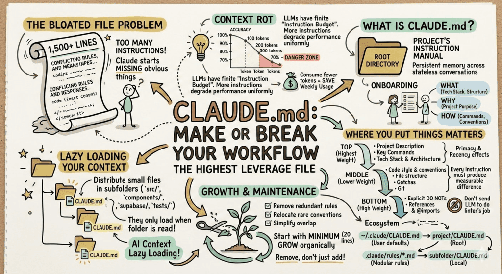 Research from Chroma on “context rot” backs this up: as the number of tokens in the context window increases, the model’s ability to accurately recall information from that context decreases. Your beautiful, comprehensive CLAUDE.md file might actually be making Claude worse at remembering what’s in it.