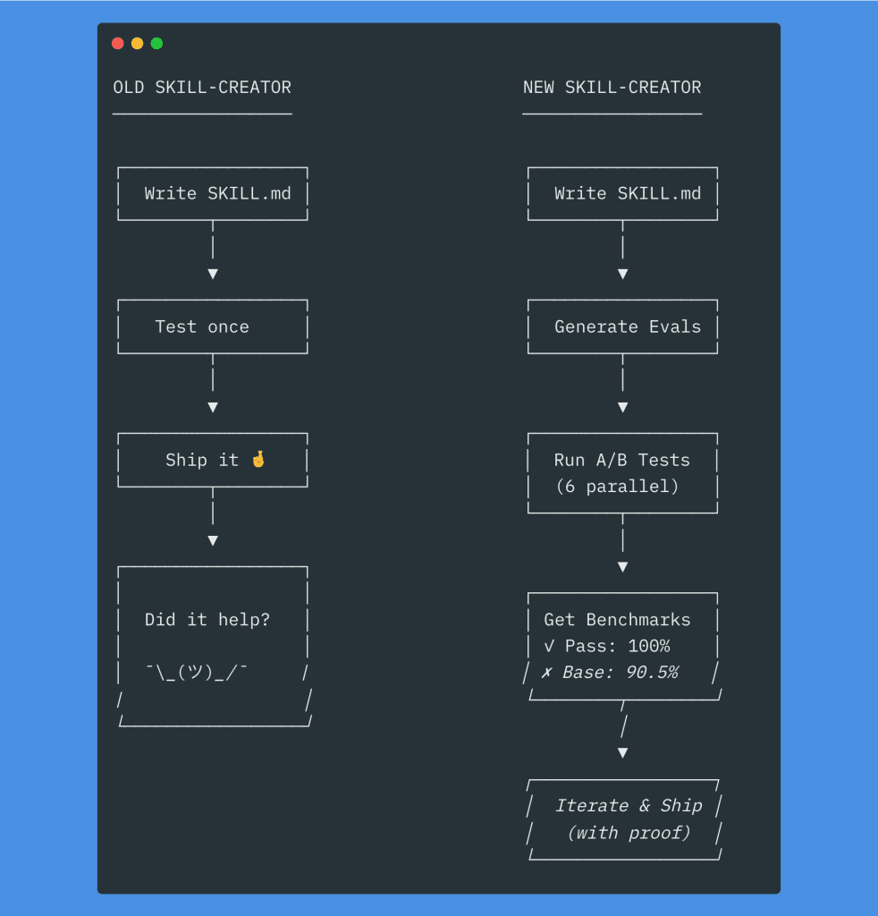 The old skill-creator plugin could generate skills for you, which was genuinely useful. But it had no evals. No testing. No benchmarks. You’d create a skill, and then… that was it. Cross your fingers, close the terminal, pretend everything was fine.