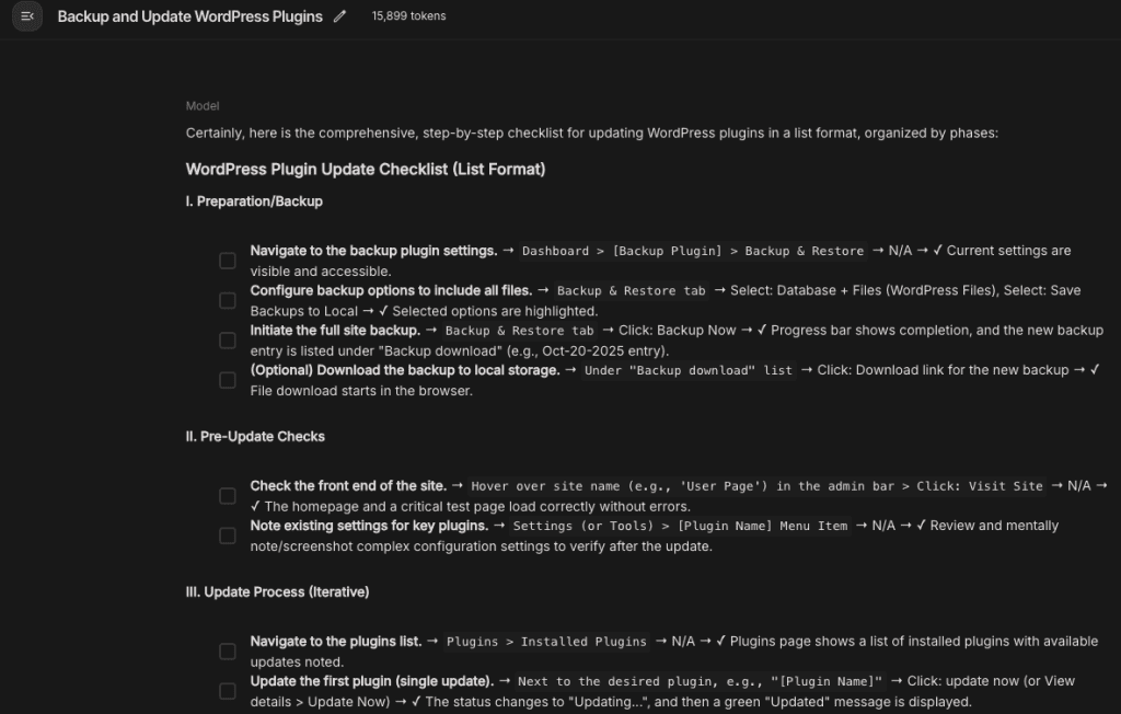 “Weekly maintenance complete. 47 plugins updated across 12 sites. Two compatibility issues detected and resolved. All sites passing health checks. Full report ready for client review.”