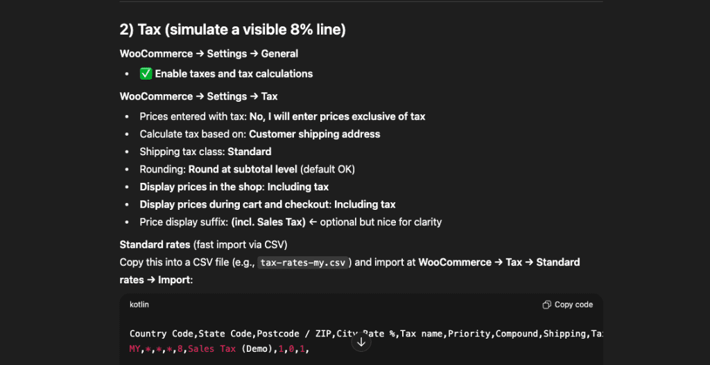It does exactly what you would do – logs in, navigates to WooCommerce → Tax → Standard Rates, changes the value, saves.